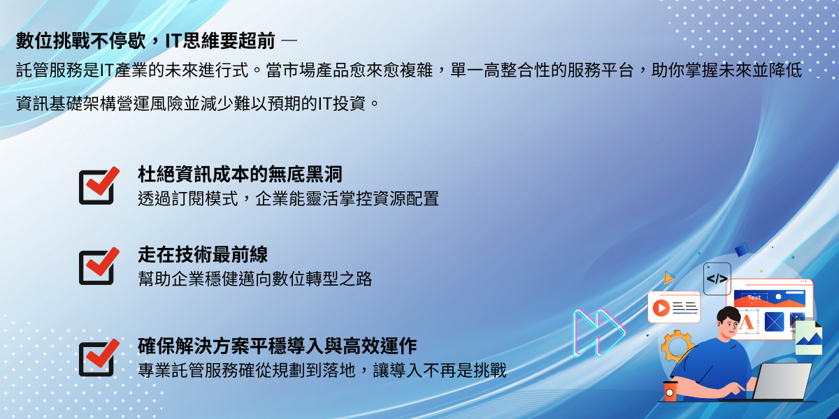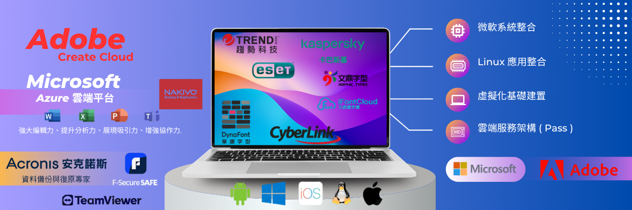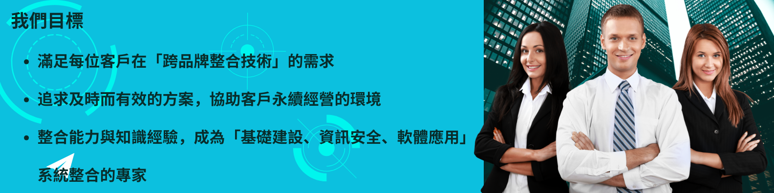 Welcome 為學校、企業、政府提供軟體、系統、雲端的整合服務 經營理念技術、服務、效率 是本公司三大服務宗旨,從簡單的軟體、硬體等產品銷售到繁雜的伺服器或網路建構,本公司皆秉持這些原則來執行 Get Started Now Watch Video 打造數位競爭力,就從 IT 轉型開始。 幫助單位有效降低資安風險,專注發展核心業務,提升組織效能。 我們能為您做到的事 我們精選適合您的軟體解決方案 協助企業選購最符合需求的軟體,節省時間與預算,避免踩雷。 了解更多 → 我們推動軟體價值最大化 提供授權完整、版本齊全的軟體銷售,讓企業投資更有保障。 了解更多 → 我們守護您的資訊資產安全 從防禦到偵測,建構多層次資安防護,降低潛在風險。 了解更多 → 我們助您靈活上雲,彈性部署 導入雲端技術,提升營運彈性與可擴充性,快速因應市場變化。 了解更多 → 我們確保系統穩定不中斷 透過持續監控與專業維護,保障企業IT運作流暢無虞。 了解更多 → 我們為您打造高效穩定的網路架構 量身設計符合企業規模與需求的網路環境,為未來發展打好基礎。 了解更多 →